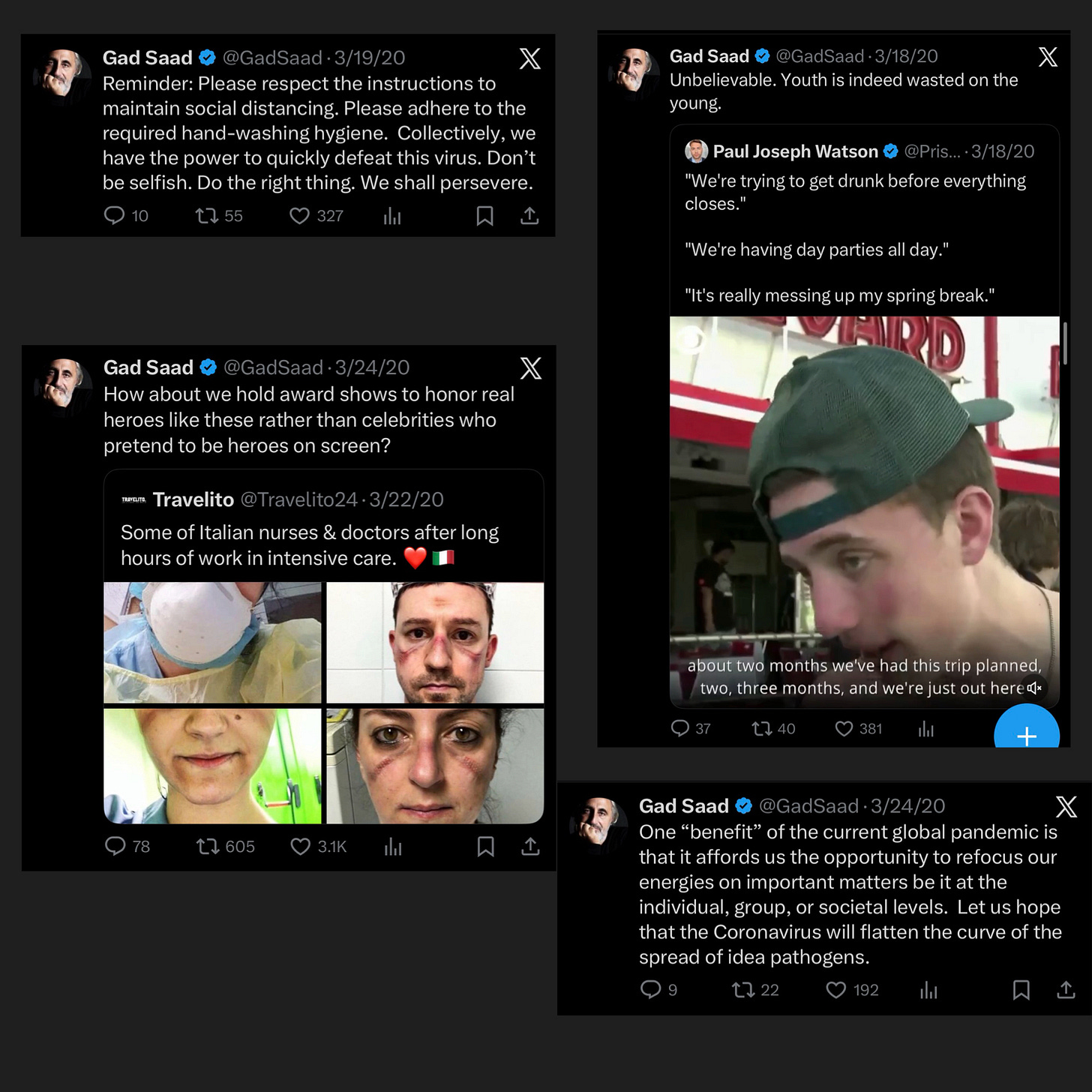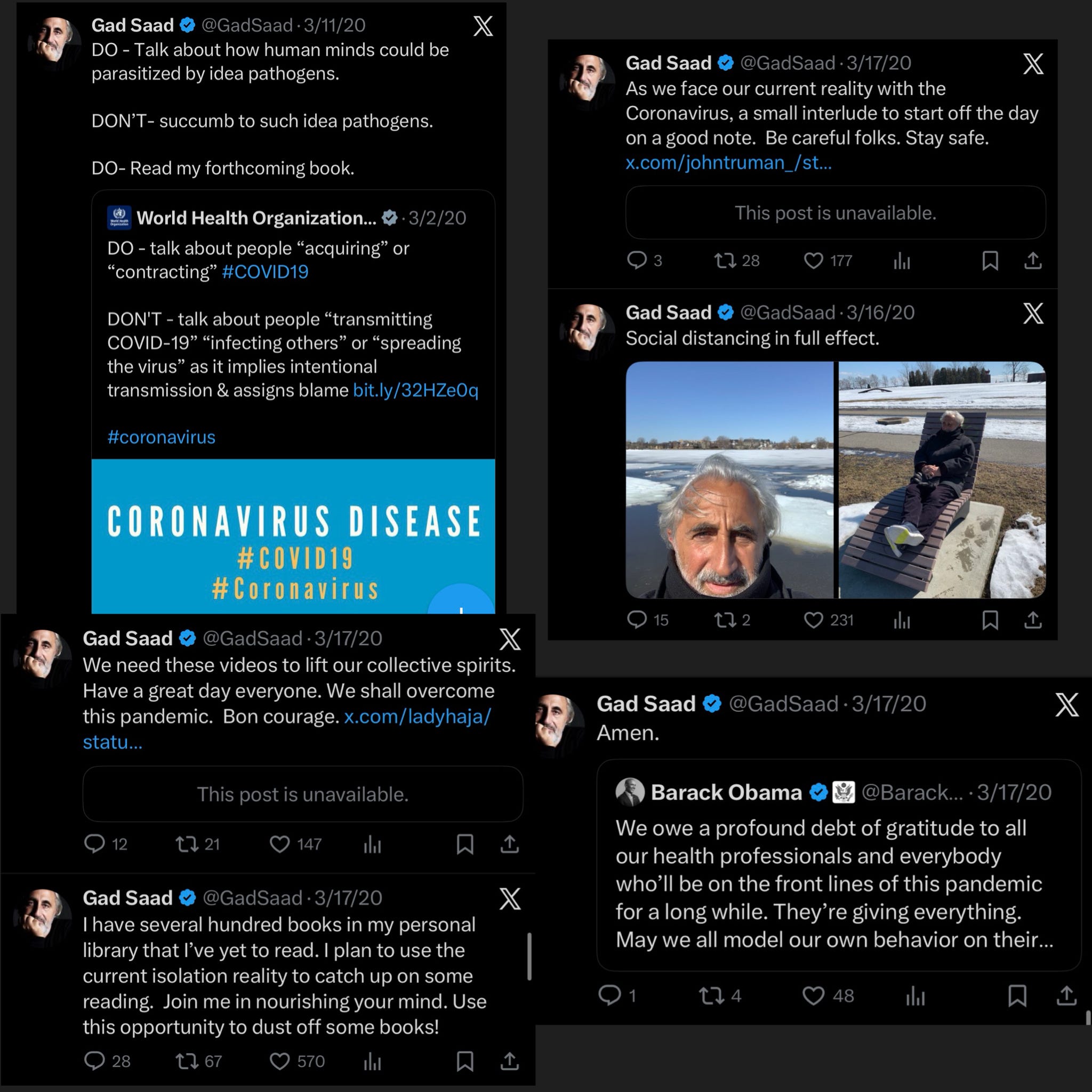 Below are screenshots of some of Gad’s tweets at the start of Covid, which — as you surely recall — became a worldwide mass hysteria and totalitarianism, one “justifying” unprecedented civil liberties violations all so as to reduce the spread of one astronomically exaggerated virus.