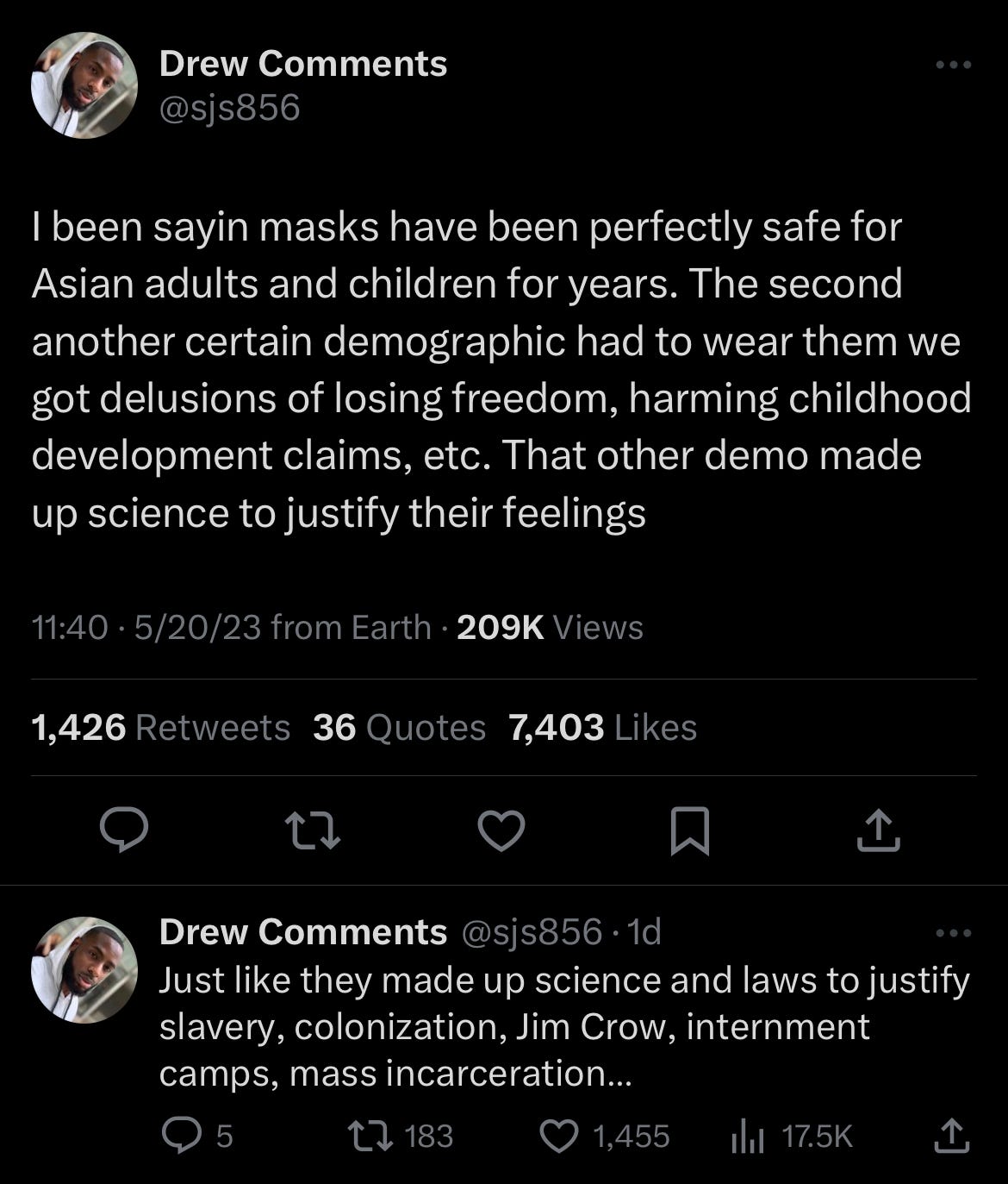 He has things exactly backward. Fauci himself recommended against wearing masks at the start. Randomized controlled trials as of 2019 said they don’t slow respiratory viruses. And they obviously cannot, because they can’t stop the smoke-like aerosols.