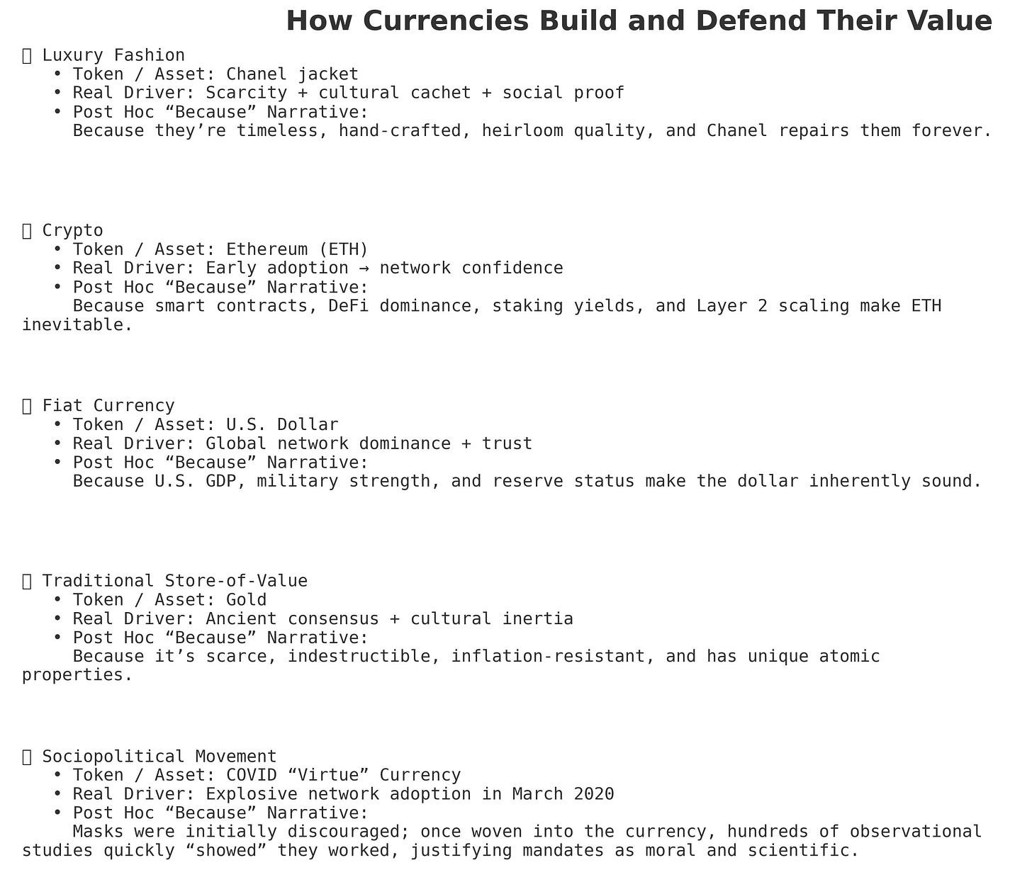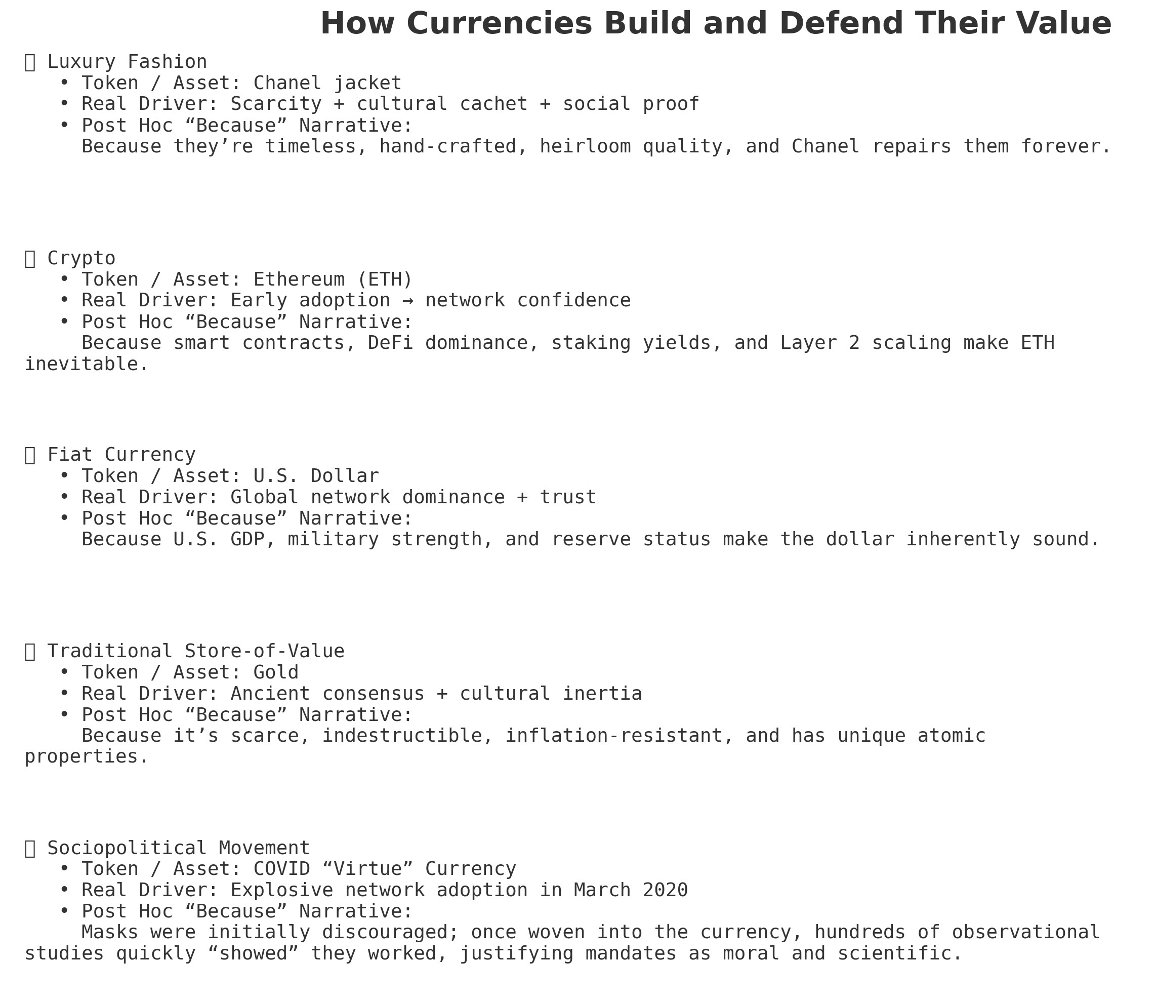 In finance, we tell ourselves the U.S. dollar is sound because GDP, military strength, and reserve status make it inherently safe. We believe Ethereum is inevitable because of smart contracts, DeFi dominance, and staking yields. In fashion, we justify a Chanel jacket’s price because of its timeless craftsmanship, heirloom quality, and infinite repairs. These stories are comforting, but they’re not the real reason these currencies hold value. They’re narratives built after the fact, designed to defend value once confidence already exists.