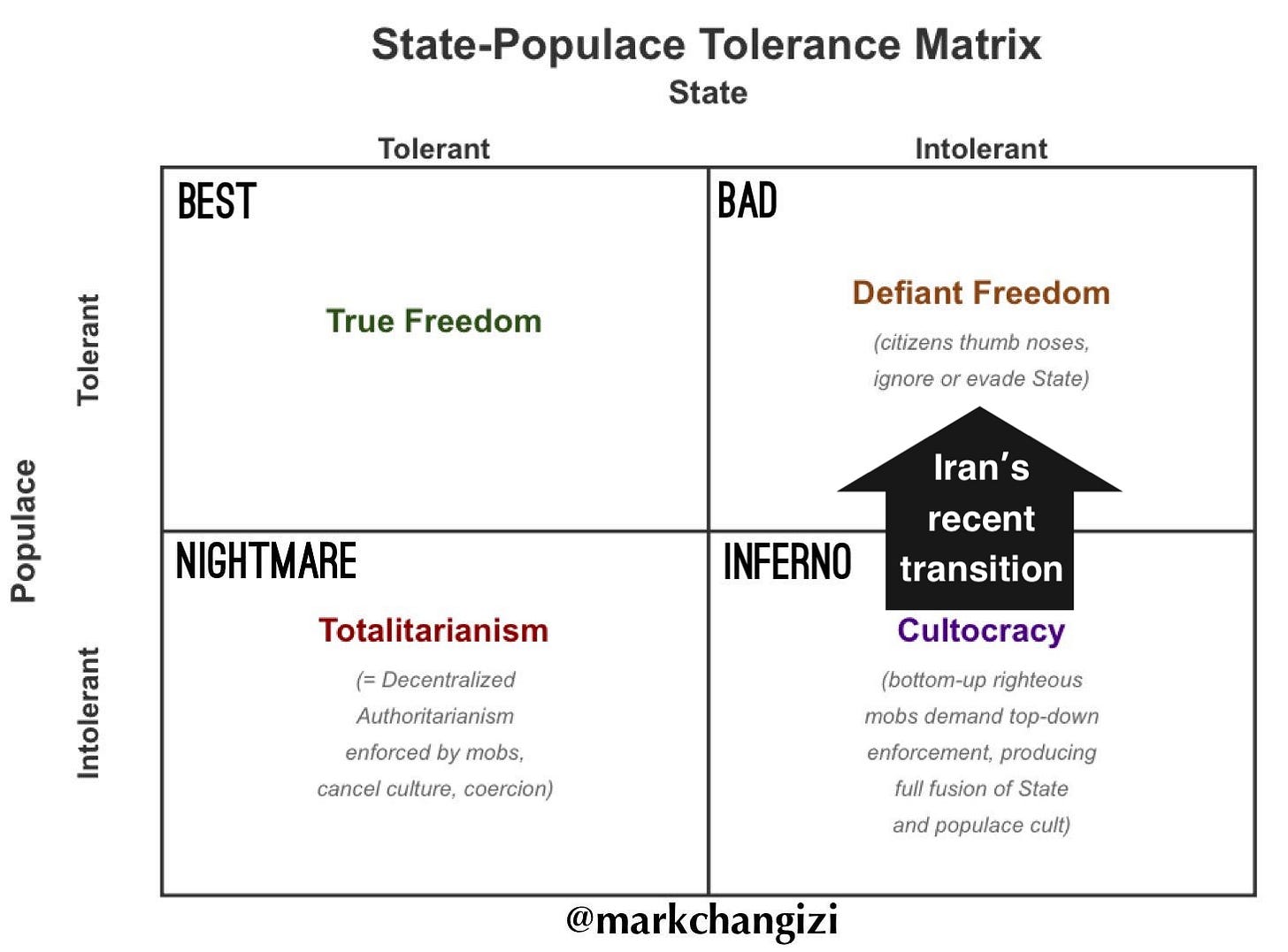 This makes the regime far more fragile. It has moved from the bottom-right of the matrix (“cultocracy”) to the top-right (top-down authoritarianism). And that is a much less stable place to be.