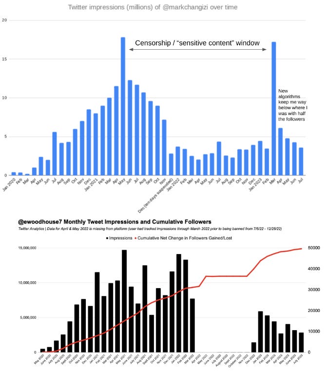 (2) The original levels of censorship were ramped up near the start of 2022. I was permanently suspended in Dec 2021, and although they accepted my appeal, I was clearly under some new, greater censorship level for more than a year until the start of 2023. Woodhouse was permanently suspended March 2022 and reinstated Dec 2022.
