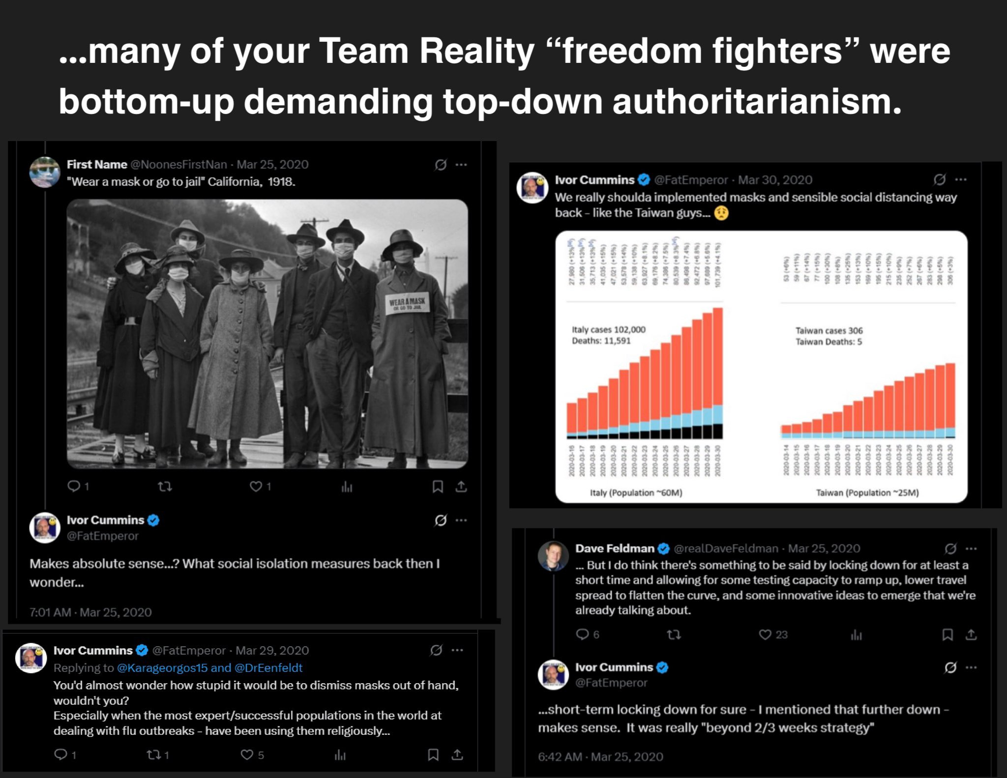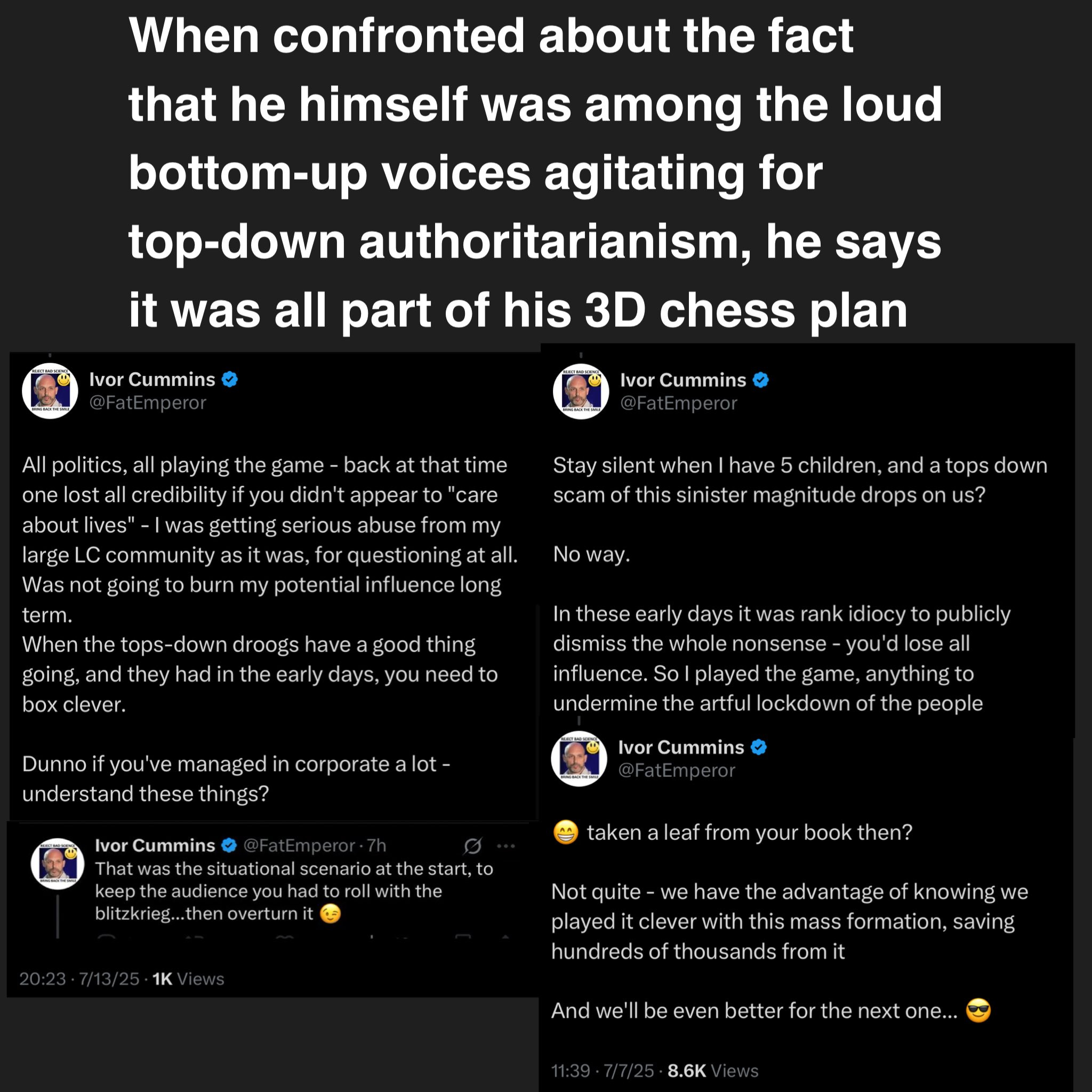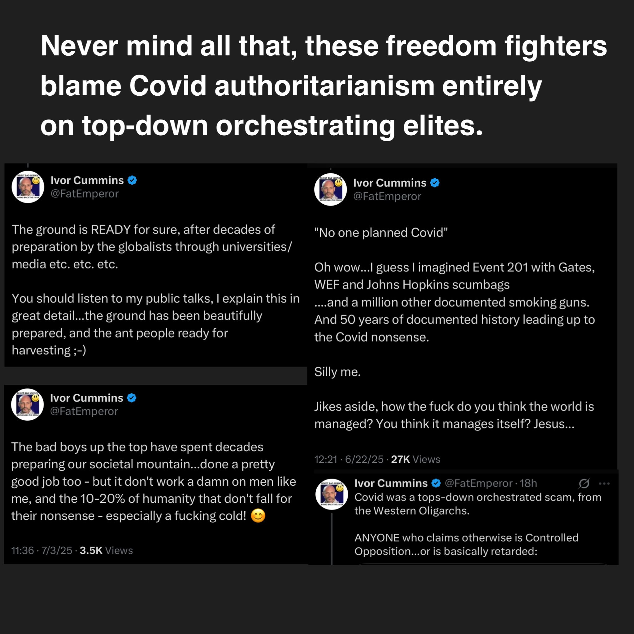 Your Fat Emperor, Ivor Cummins, follows the classic Plandemic grifter arcMark ChangiziJul 28, 202571ShareYour Fat Emperor, Ivor Cummins, follows the classic Plandemic grifter arc:(1) While officials urged calm(2) he screamed for lockdowns and masks(3) then flipped to blaming shadowy elites(4) and now writhes when receipts surface